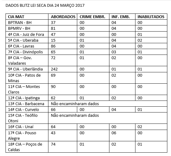 O Governo de Minas Gerais, por meio da Secretaria de Segurança Pública (Sesp), coordenou diversas blitze especiais e simultâneas em 18 cidades de todas as regiões do estado na madrugada de sábado (25/3). A ação resultou na prisão de pelo menos cinco pessoas por crime de trânsito.
