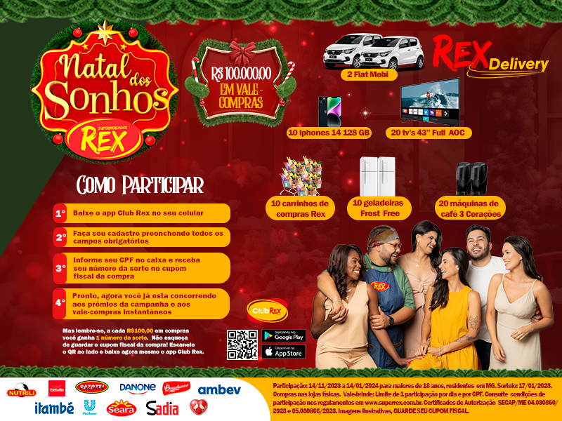 A campanha que já começou e encerrará no dia 14 de janeiro de 2024, irá sortear 2 carros 0km, 20 Tvs 43 polegadas, 10 geladeiras, 10 iphones 14, 10 carrinhos de compras Rex, 20 máquinas de café e R$100.000,00 em vale-compras.