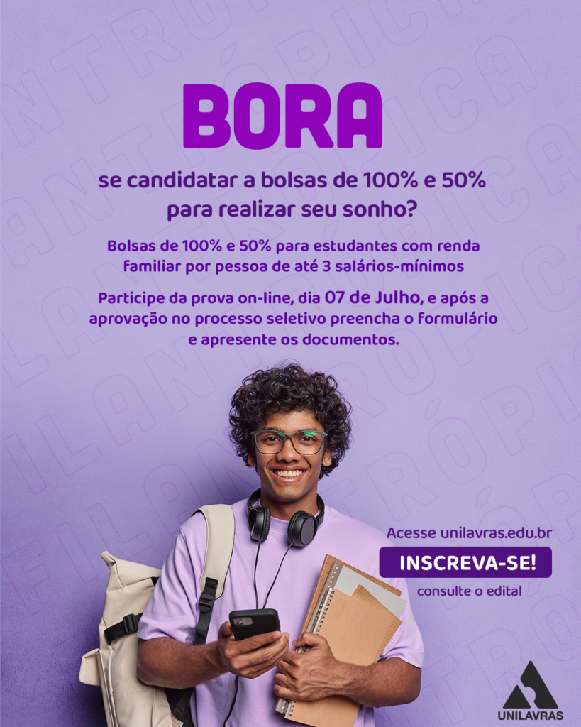 Se você precisava de um empurrãozinho para realizar o sonho de fazer uma faculdade, a oportunidade perfeita chegou. O Unilavras está com inscrições abertas até o dia 5 de julho para o programa de Bolsas Filantrópicas, que oferece bolsas parciais e integrais para diversos cursos de graduação.