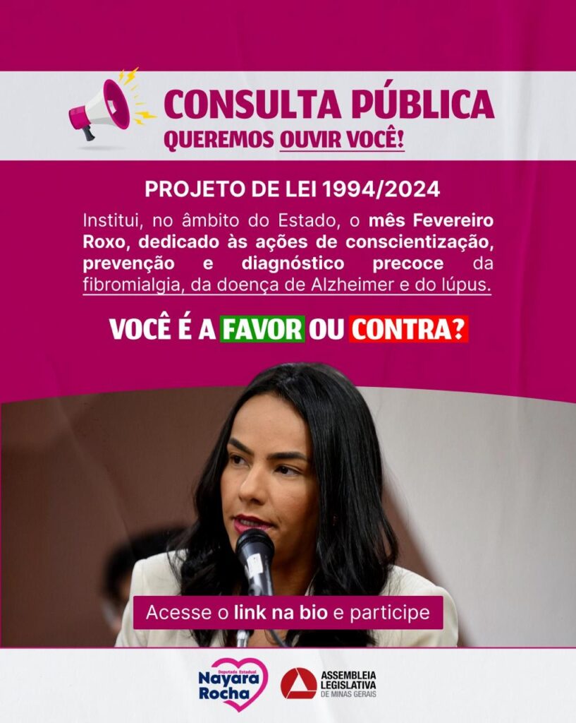 Participe e vote nesta importante consulta pública sobre o Projeto de Lei 1994/2024. Este projeto propõe instituir o mês Fevereiro Roxo, dedicado às ações de conscientização, prevenção e diagnóstico precoce da fibromialgia, da doença de Alzheimer e do lúpus.