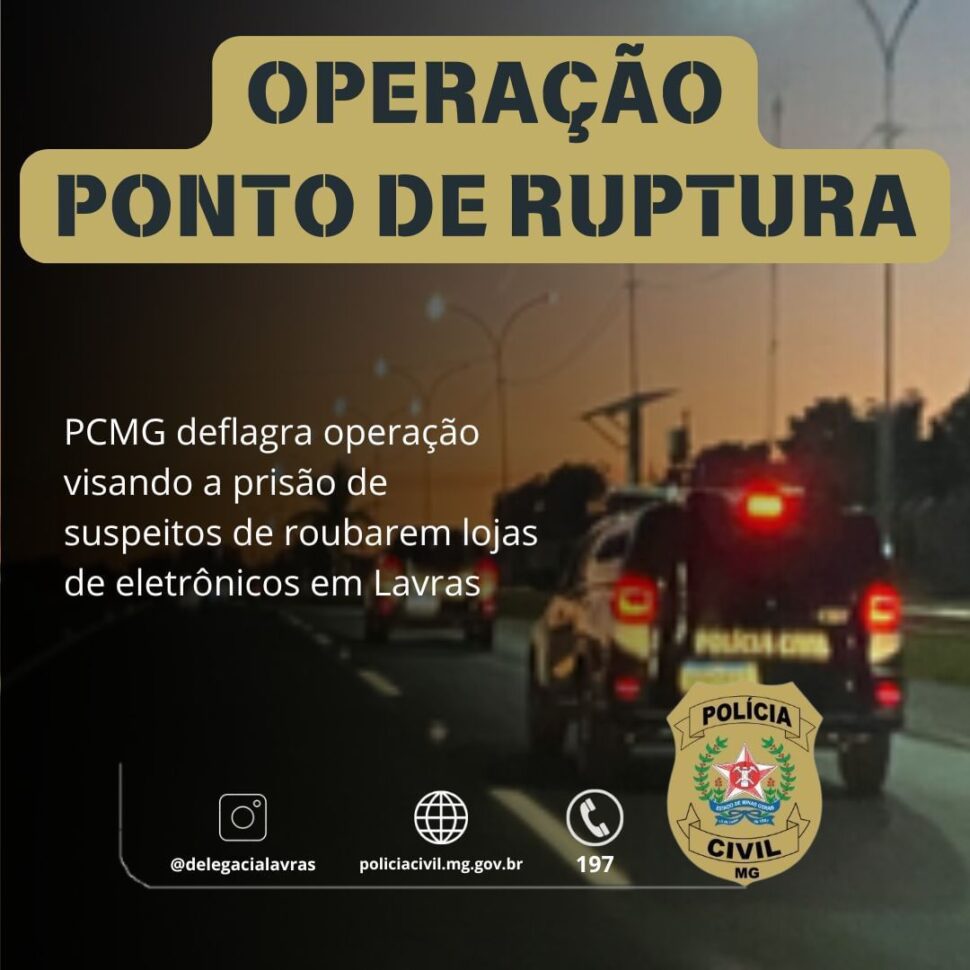Na manhã desta segunda-feira (23/9), a Polícia Civil de Minas Gerais (PCMG) desencadeou a operação Ponto de Ruptura e cumpriu mandados de prisão preventiva contra três homens, de 20, 21 e 38 anos, apontados como responsáveis por roubos a lojas de eletrônicos em Lavras e região.