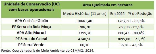 Em que pese o ano recorde de atendimentos, as estatísticas revelaram uma redução de 20,3% de área queimada nas UCs e zonas de amortecimento. Os dados validam a eficiência da instalação das bases operacionais e a efetividade de investimentos do Governo de Minas na Força Tarefa Previncêndio (FTP).